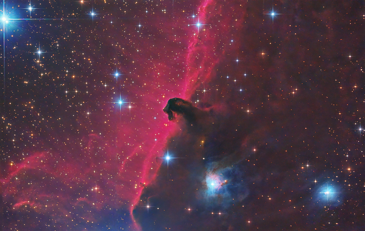 Also visible to the lower part of the Horse Head NGC 2023 which appears as a "light blue rose" and to the right and a bit small IC 435; both are reflection nebulae and fantastic objects as well but of course, overwhelmed by the magnificence of Barnard 33 and IC 434.