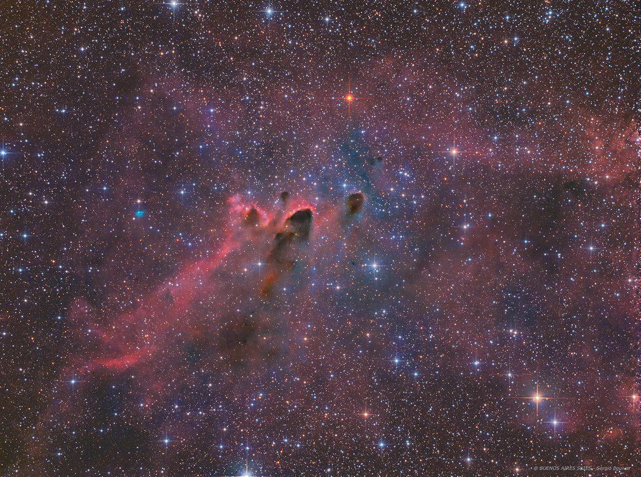 CG30 and CG31 are part of a Cometary Globule grouping located in Pupis and Vela within the Gum Nebula. The region is located roughly 1,000 light years away from us. Only discovered in 1976, Cometary Globules (aka CGs) are interstellar clouds that show a head ± tail morphology similar to the comets. The heads are compact and bright-rimmed. They are completely opaque so that no background stars are seen through them. A faintly luminous tail extending from the head generally points away from a nearby bright early-type star. Systems of CGs have been found in a number of star-forming regions with massive OB type stars. The complex also includes dark dust clouds and a Herbig-Haro object (HH 120), and shows signs of recent star formation within its head.