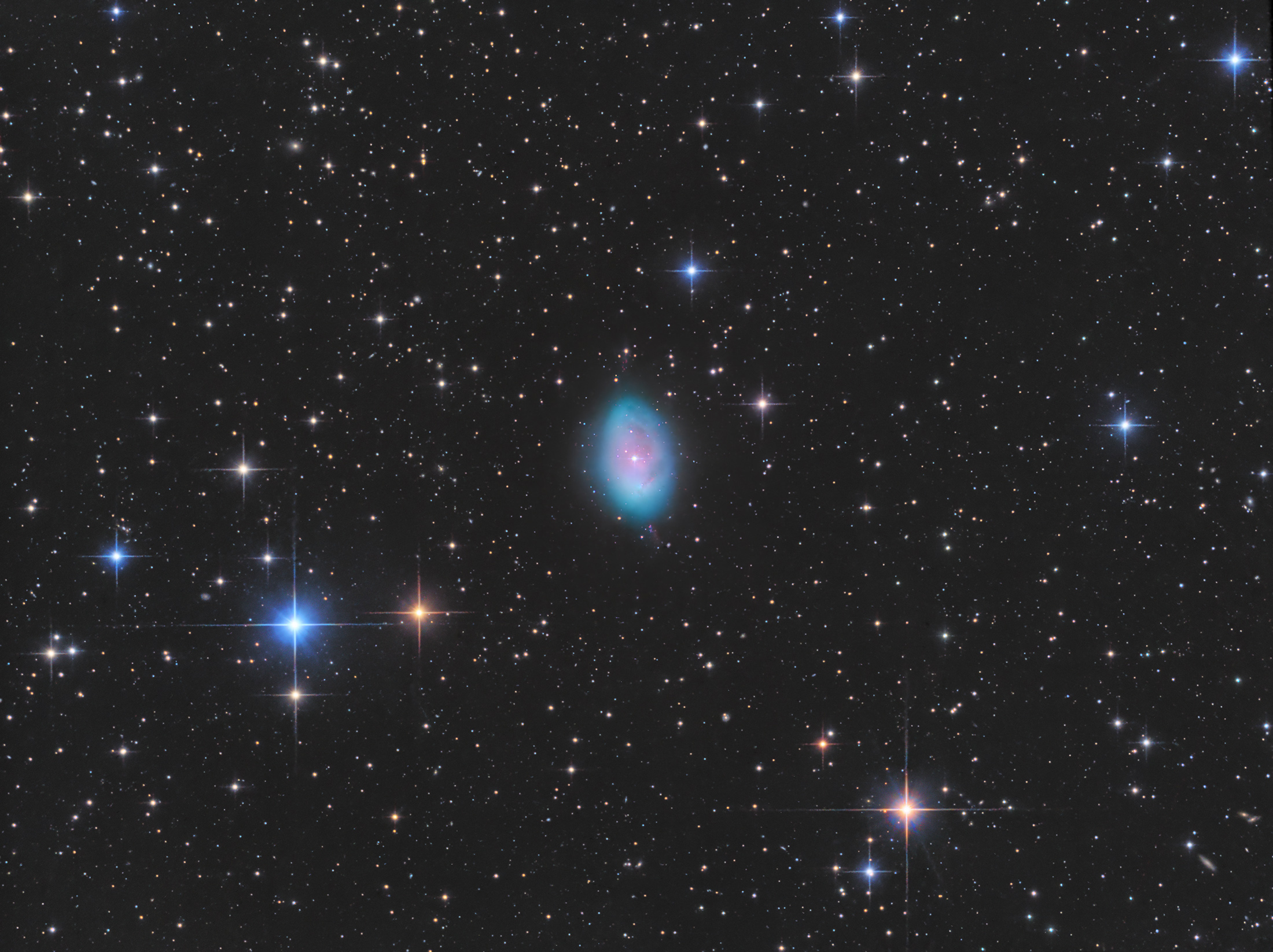The cosmic cloud spans about 3 light-years, nestled securely within the boundaries of the southern constellation of the Furnace (Fornax). NGC 1360 current stage corresponds to a brief and final phase in the evolution of an aging star. In fact, visible at the center of the nebula, we have the central star which is less massive but much hotter than our Sun. Their intense and otherwise invisible ultraviolet radiation has stripped away electrons from the atoms in a mutually surrounding gaseous shroud. The blue-green hue inside of NGC 1360 seen in the image is the strong emission produced as electrons recombine with doubly ionized oxygen atoms.