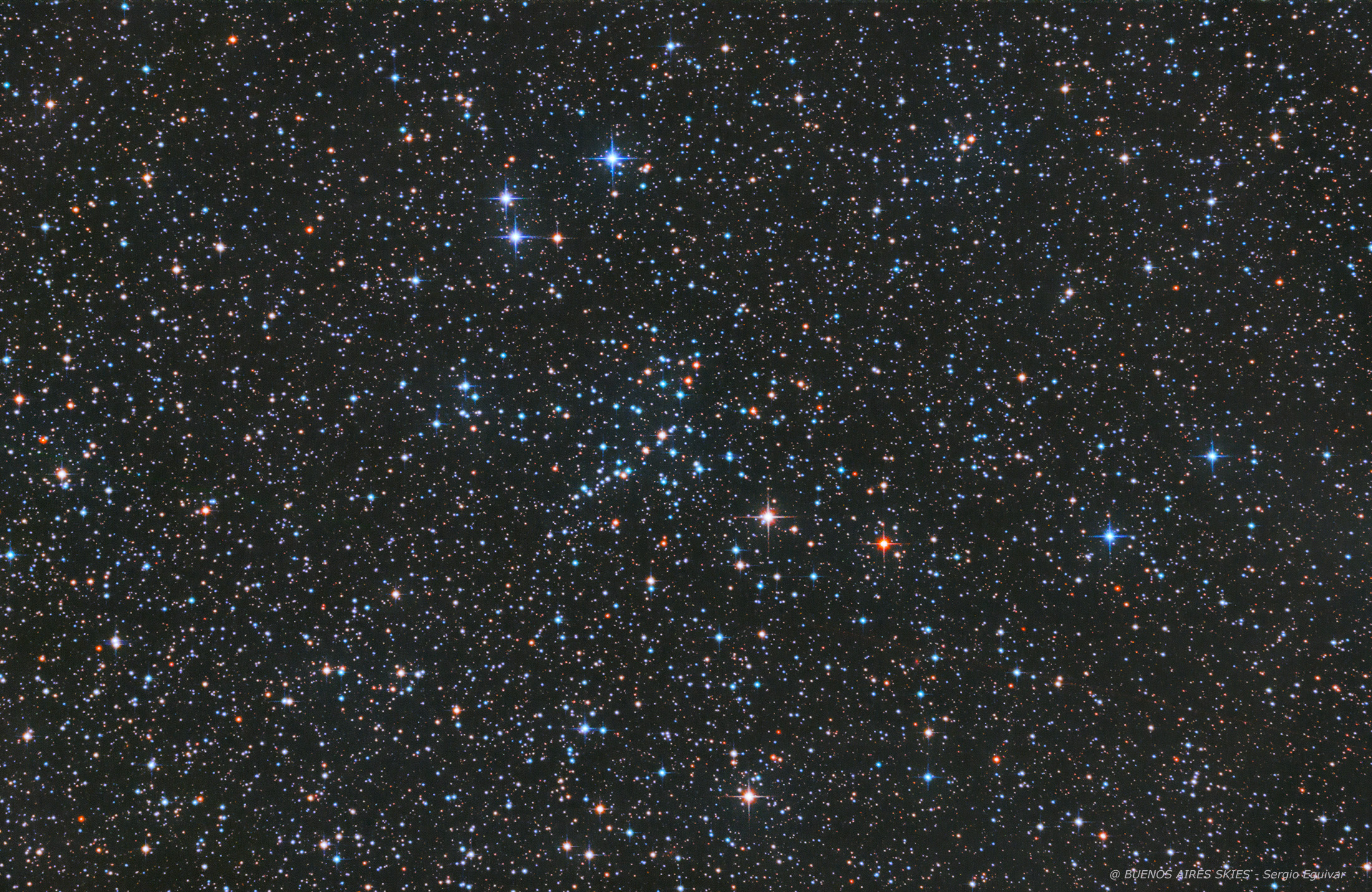 NGC 2482 is an open cluster located in the constellation Puppis (the Stern). It was discovered by the German-British astronomer William Herschel in 1784. NGC 2482 is approximately 1,343 pc (∼4,380 light-years) from the Solar System, and the latest estimates give it an age of 402 million years. The cluster's apparent size is 10 arcminutes, which, given its distance, gives a maximum actual size of about 13 light-years. According to Robert Trumpler's classification of open clusters, this cluster contains between 50 and 100 stars (letter m) with a moderately low concentration (III) and magnitudes spread over a small range (the number 1).
