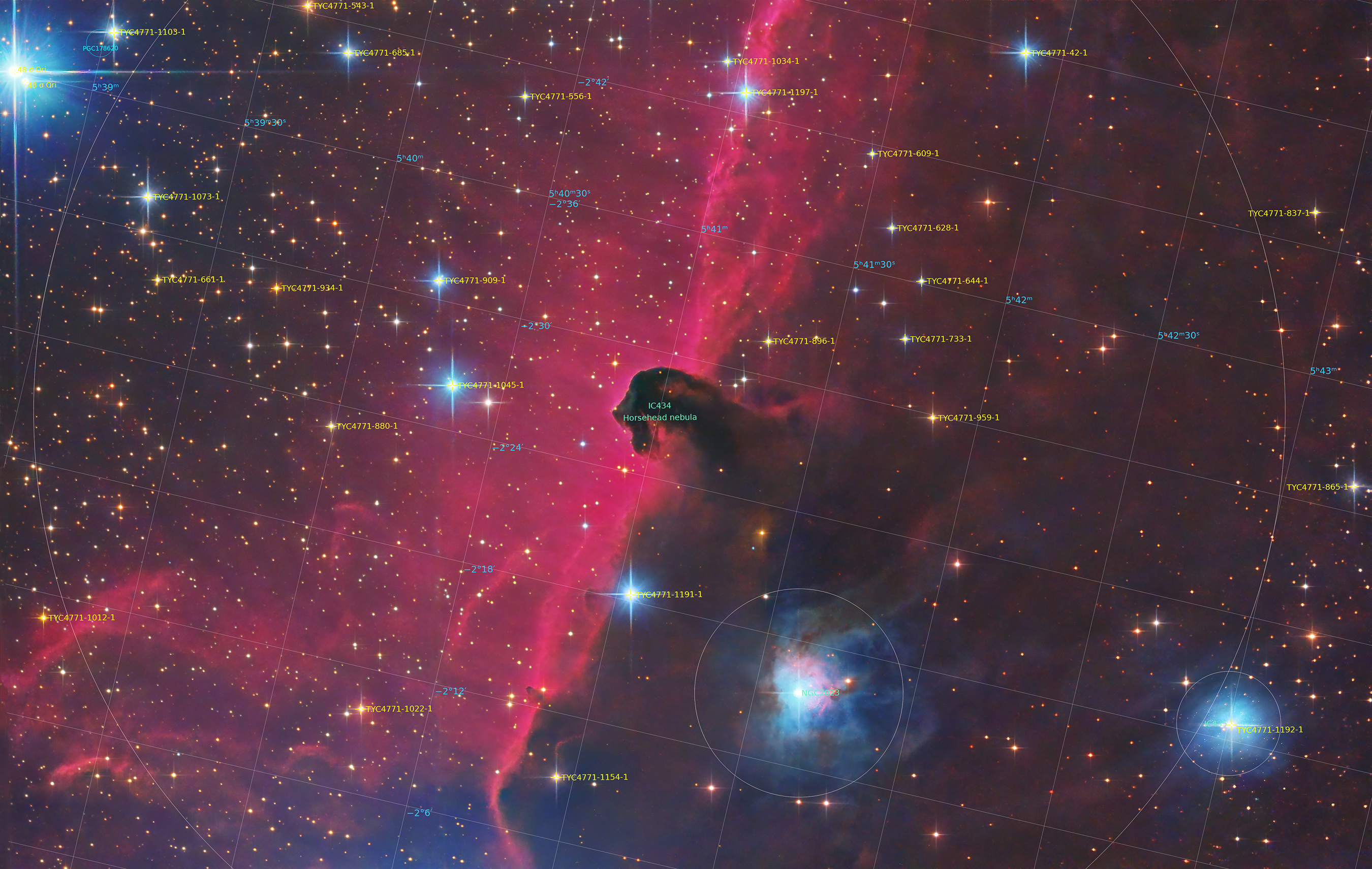 Also visible to the lower part of the Horse Head NGC 2023 which appears as a "light blue rose" and to the right and a bit small IC 435; both are reflection nebulae and fantastic objects as well but of course, overwhelmed by the magnificence of Barnard 33 and IC 434.