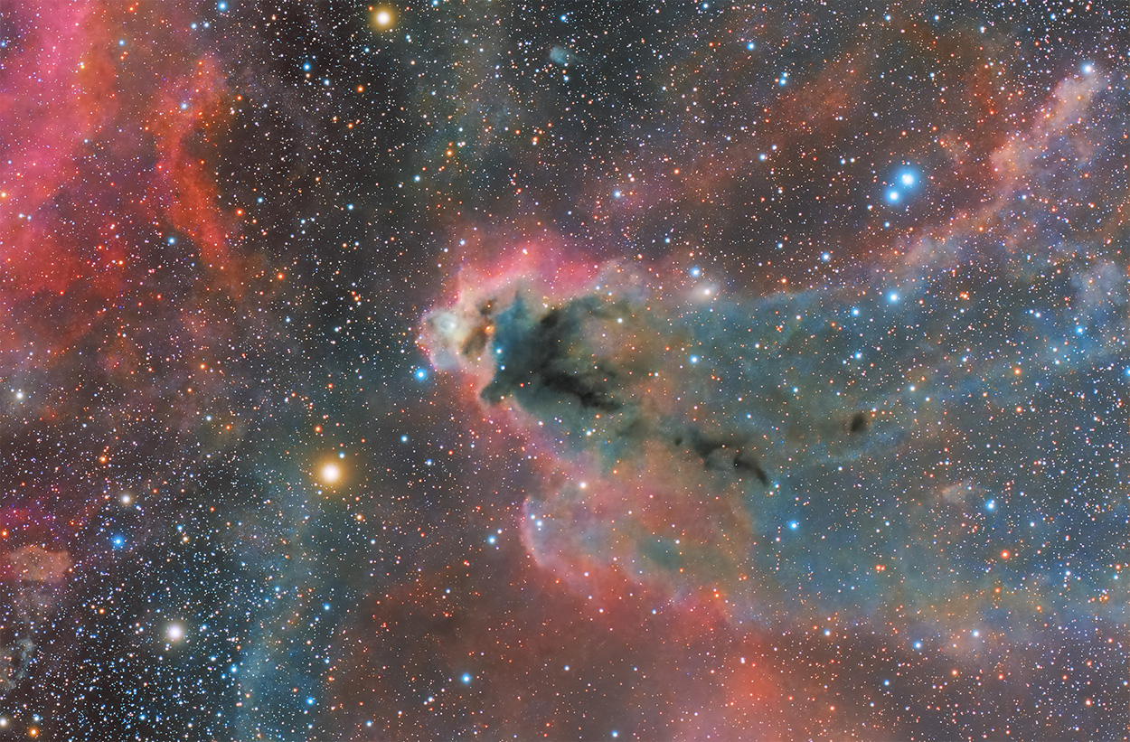 To some, the dark shape looks like a mythical boogeyman. Scientifically, Lynds' Dark Nebula (LDN) 1622 appears against a faint background of glowing hydrogen gas only visible in long telescopic exposures of the region. In contrast, the brighter reflection nebula vdB 62 is more easily seen just above and to the right of center in the featured image. LDN 1622 lies near the plane of our Milky Way Galaxy, close on the sky to Barnard's Loop, a large cloud surrounding the rich complex of emission nebulae found in the Belt and Sword of Orion. With swept-back outlines, the obscuring dust of LDN 1622 is thought to lie at a similar distance, perhaps 1,500 light-years away. At that distance, this 2-degree wide field of view would span about 60 light-years. (*)