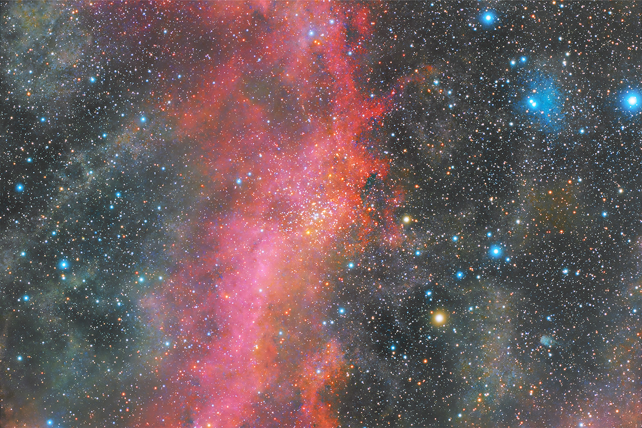 NGC 2112 is an intermediate-age open cluster located in the constellation Orion, first discovered by William Herschel in 1786. Situated approximately 850 parsecs (2,770 light-years) away, it has a visual magnitude of 9.1, making it visible with binoculars or small telescopes. It is characterized as a moderately concentrated cluster containing roughly 50 to 100 stars. The reddish glow seen in the background in this image ionized Hydrogen gas. This gas is pat of a larger structure known as Barnard's Loop. NGC 2112's age is estimated at about 2 billion years. Observations of NGC 2112 have also led to the discovery of brown dwarfs, which are objects that are too massive to be considered planets but not massive enough to undergo sustained hydrogen fusion in their cores like stars. In 2000, a team of astronomers discovered four brown dwarf candidates in the cluster using deep infrared imaging.