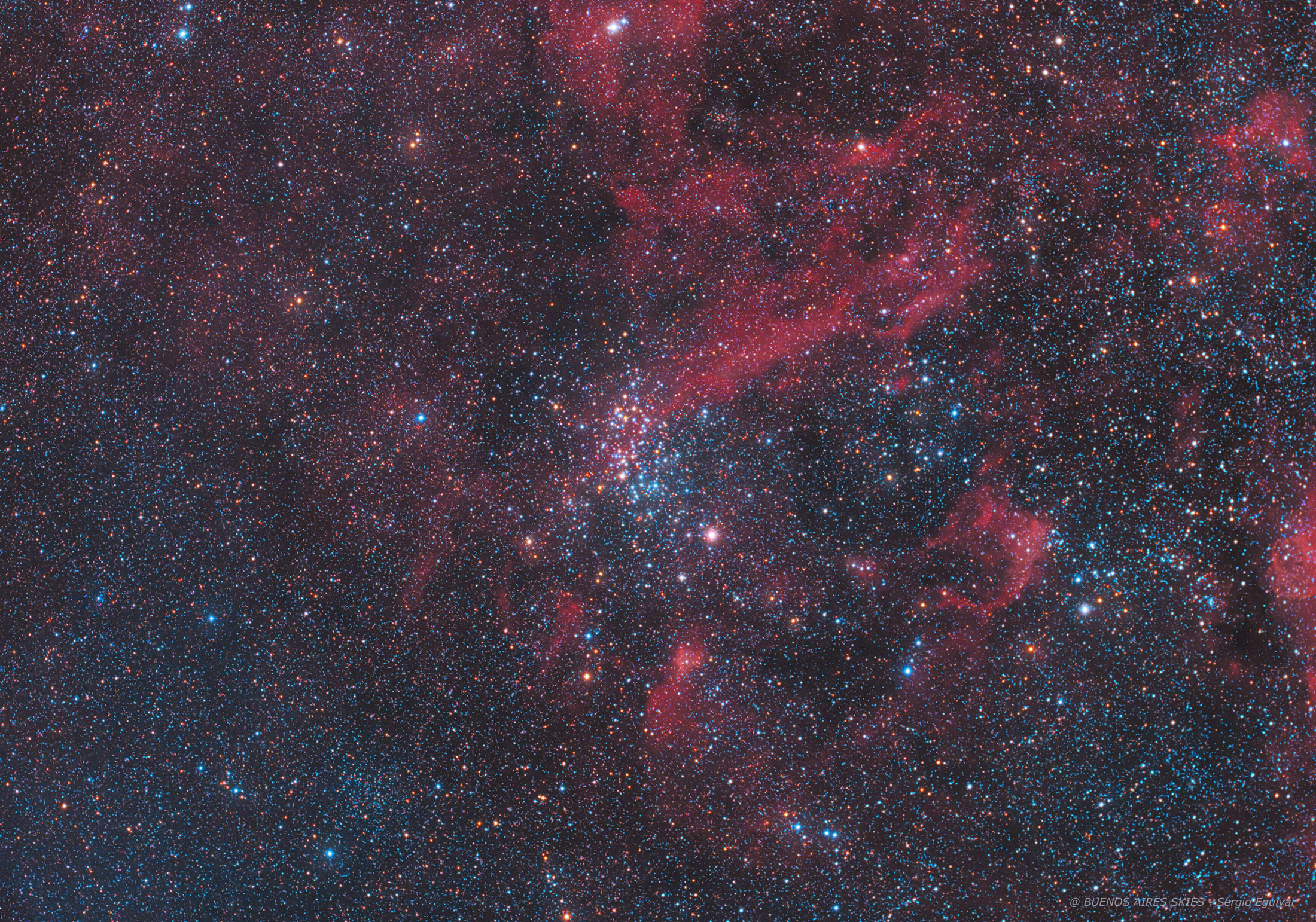 To the lower side of the image we have open cluster Trumpler 19 with a diameter of 10 arc minutes and shining at 9.6 magnitude. To the upper right corner is also visible NGC 3496 with 7 arc seconds in diameter and 8.2 magnitude. The nebula crossing the cluster is Gum 54 which lies in the direction of the Car OB2 association and parts of it may be ionized by stars in that association. Gum splits this region into several distinct nebulae and the RCW catalog itself splits the region into four sub nebulae, which are described separately as RCW 54a, 54b, 54c and 54d.